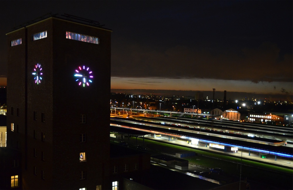 Bürger Oberhausens, Passanten und Bahnreisende! Endlich lohnt es sich wieder nach oben zu schauen, denn nach vielen Jahren des Stillstands werden am 12.11.2010 die Uhren des Bahnhofsturms in Betrieb genommen. Dabei werden sie als Kunstwerk in einem neuen Licht erstrahlen. Wir, das sind Ateliers Stark aus Berlin und kitev (Kultur im Turm) aus Oberhausen mit Unterstützung von Osram und Nanotech, haben keinen Aufwand gescheut und modernste LED-Technik eingesetzt um die Uhren in allen denkbaren Farben zum Leuchten zu bringen und somit einzigartig zu machen. Angetrieben werden die Uhren durch drei digital angesteuerte Schrittmotoren mit Planetengetrieben. Oberhausen bekommt die Bahnhofsuhr 2.0!
