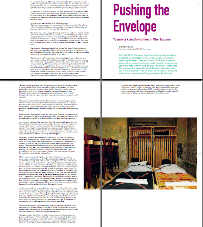 At RUHR.2010, European Capital of Culture, the Netherlands presented GastGastgeber, 'guest-host', a series of projects exploring the event's theme of 'reuse'. The first of these projects, an intervention in a former water tower in Oberhausen, opened in May with the help of kitev, the artists' organisation that manages the tower.