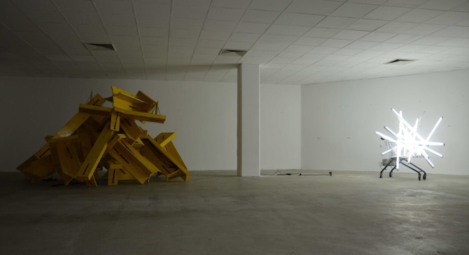 Wir haben ein handgemachtes Provisorium geschaffen mit minimalen Mitteln: Wiederverwendete Requisiten der Ruhrtriennale, Klebeband, Einkaufswägen und Leuchtstofflampen. Das Motto 'Slow City' prangt an den Wänden, weil wir im fehlenden Investitionsdruck in den Innenstädten nicht nur leere Ladenlokale entstehen sehen, sondern Freiräume. So gesehen ist Leerstand ist nicht nur Makel, sondern eine Chance etwas Neues auszuprobieren.