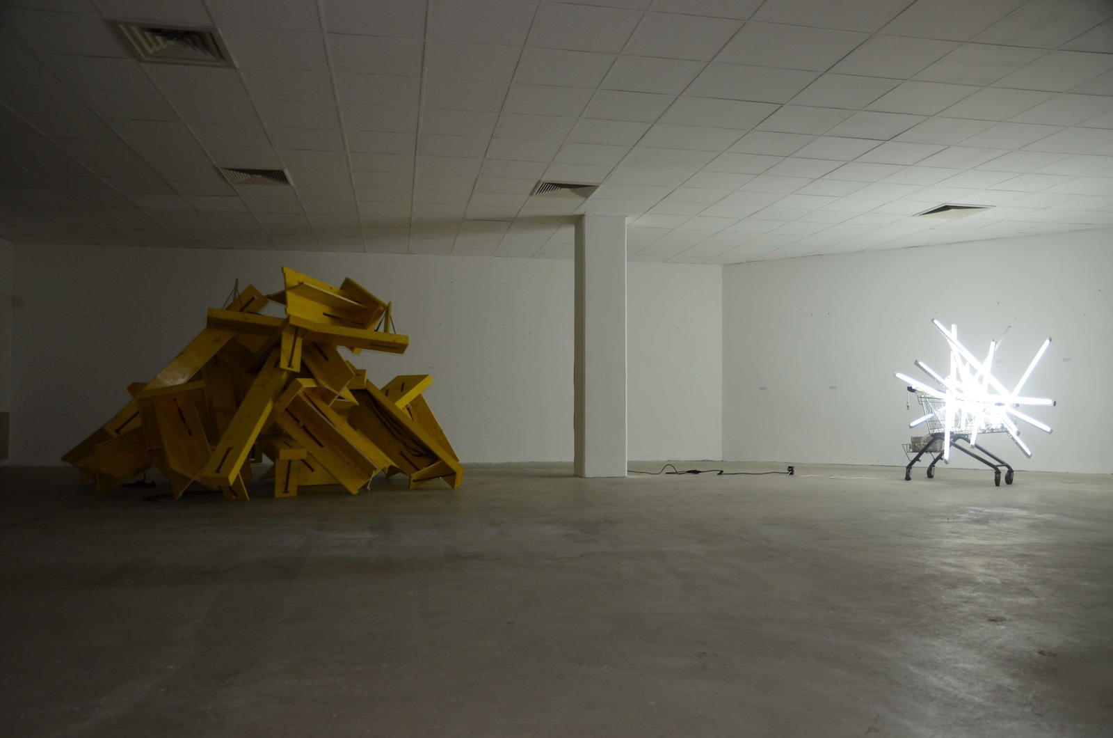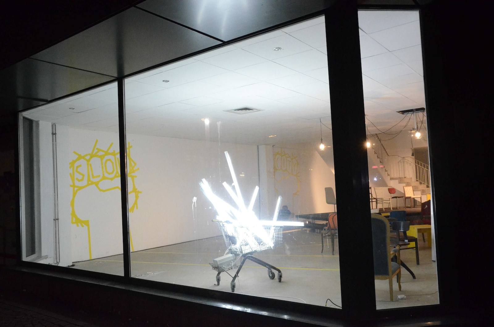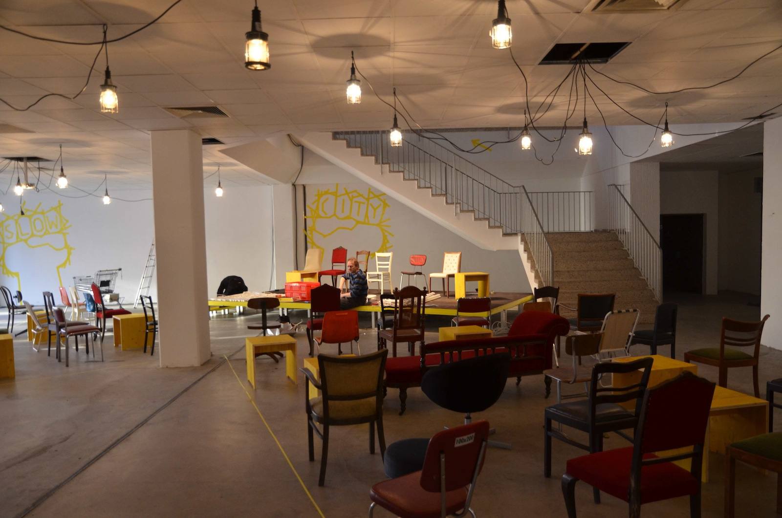 Wir haben ein handgemachtes Provisorium geschaffen mit minimalen Mitteln: Wiederverwendete Requisiten der Ruhrtriennale, Klebeband, Einkaufswägen und Leuchtstofflampen. Das Motto 'Slow City' prangt an den Wänden, weil wir im fehlenden Investitionsdruck in den Innenstädten nicht nur leere Ladenlokale entstehen sehen, sondern Freiräume. So gesehen ist Leerstand ist nicht nur Makel, sondern eine Chance etwas Neues auszuprobieren.