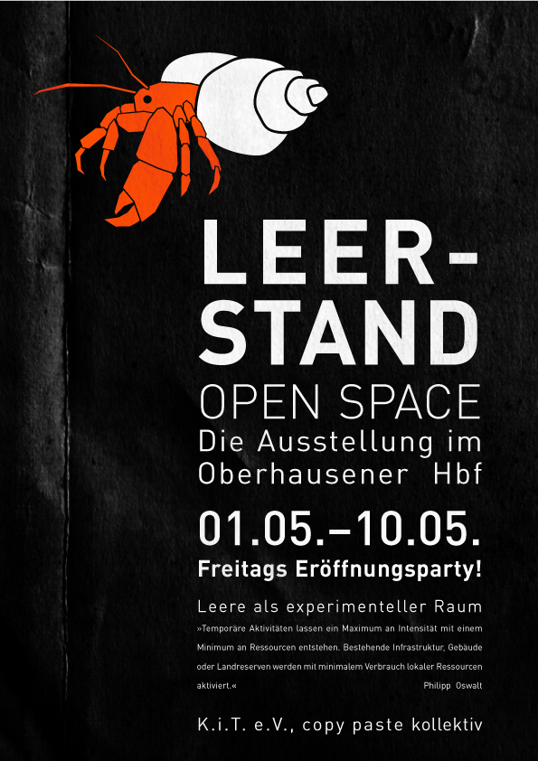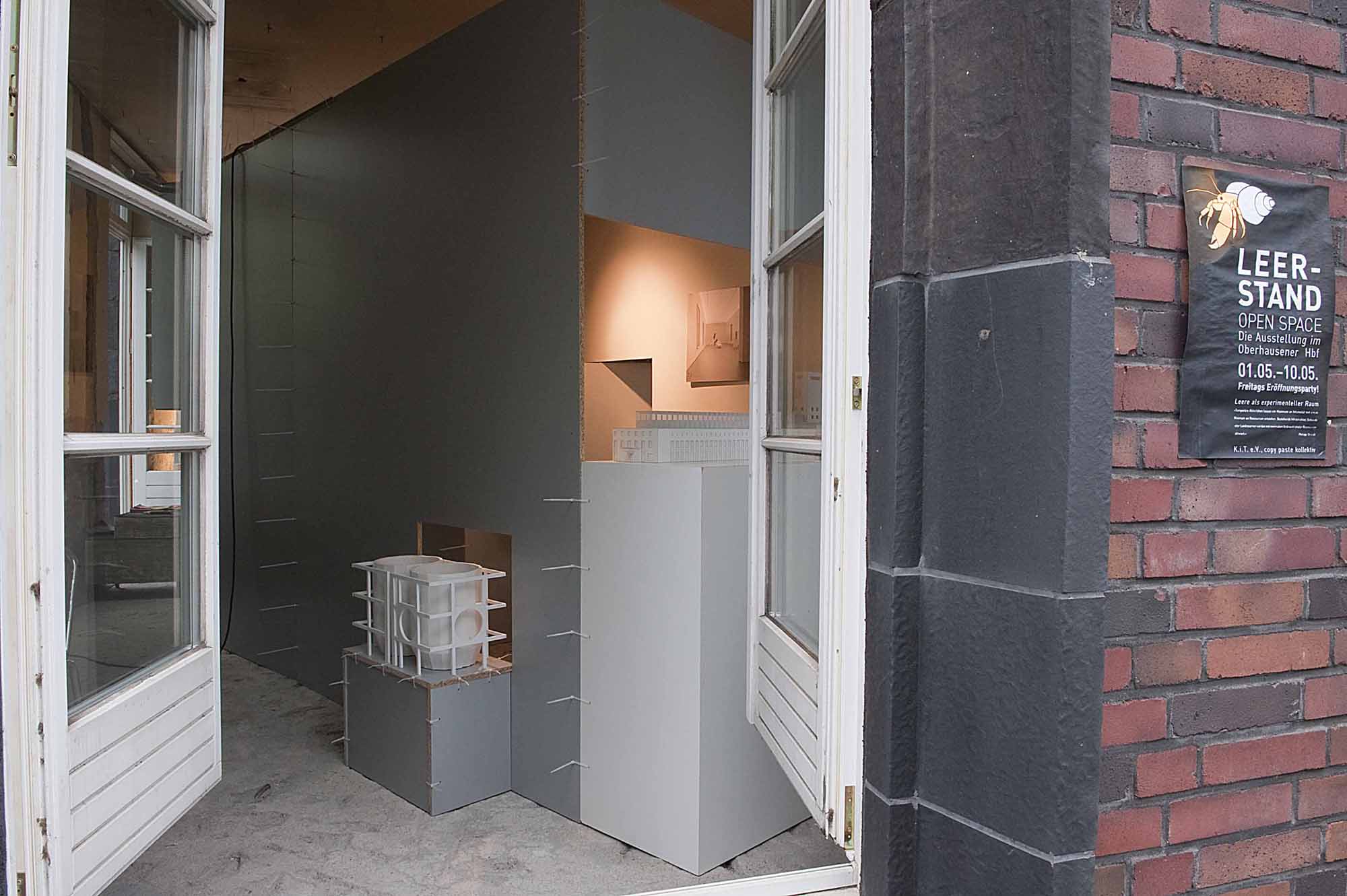 Leerstand - die Ausstellung thematisiert und akzeptiert die Leere als experimentellen Raum – sie fügt nur temporär eine Nutzung hinzu. Zwischennutzung setzt meist ein effizientes Minimum an eigenen Mitteln ein: Wer sich provisorisch niederlässt, richtet sich nicht umfangreich und kostspielig ein. „Temporäre Aktivitäten lassen ein Maximum an Intensität mit einem Minimum an Ressourcen entstehen [...] Bestehende Infrastruktur, Gebäude oder Landreserven werden mit minimalem Verbrauch lokaler Ressourcen aktiviert“ (Philipp Oswalt) Zwischennutzung profitiert damit gerade vom wirtschaftlichen Desinteresse an bestimmten städtischen Räumen.
