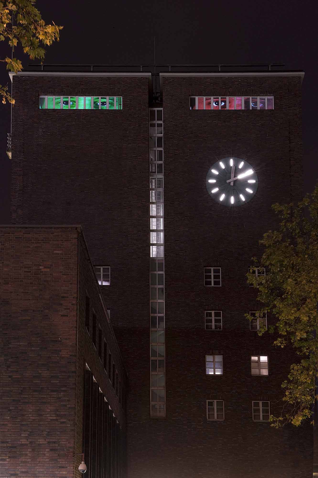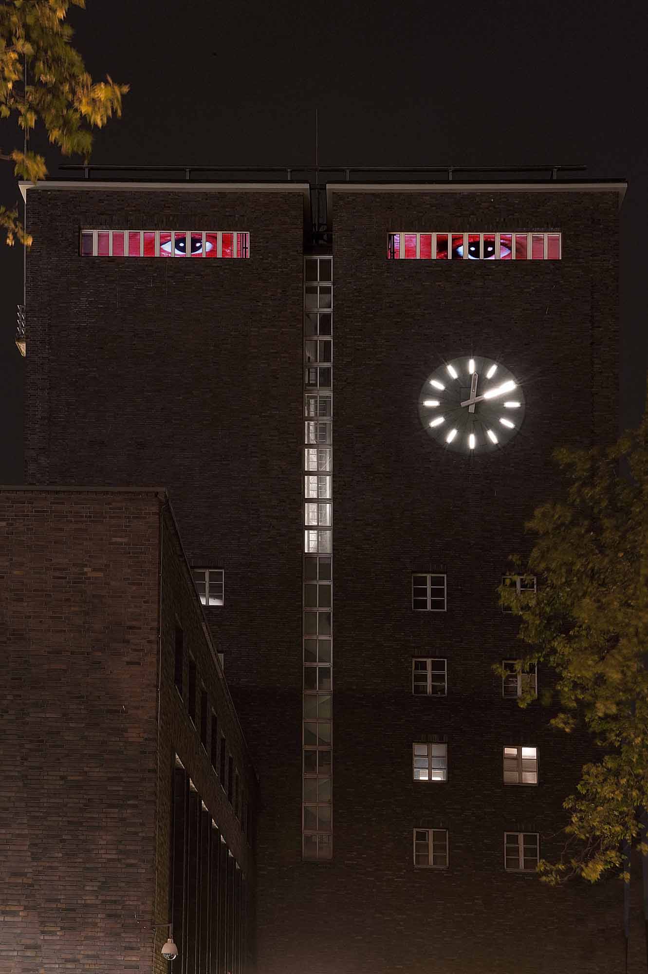 Die Fenster unter dem Turmdach fungierten als Projektionsfläche für eine Bild- und Videoinstallation, und verwandelten den Turm zudem in ein weithin sichtbares Hinweisschild für die stattfindende Ausstellung und die Kurzfilmtage.