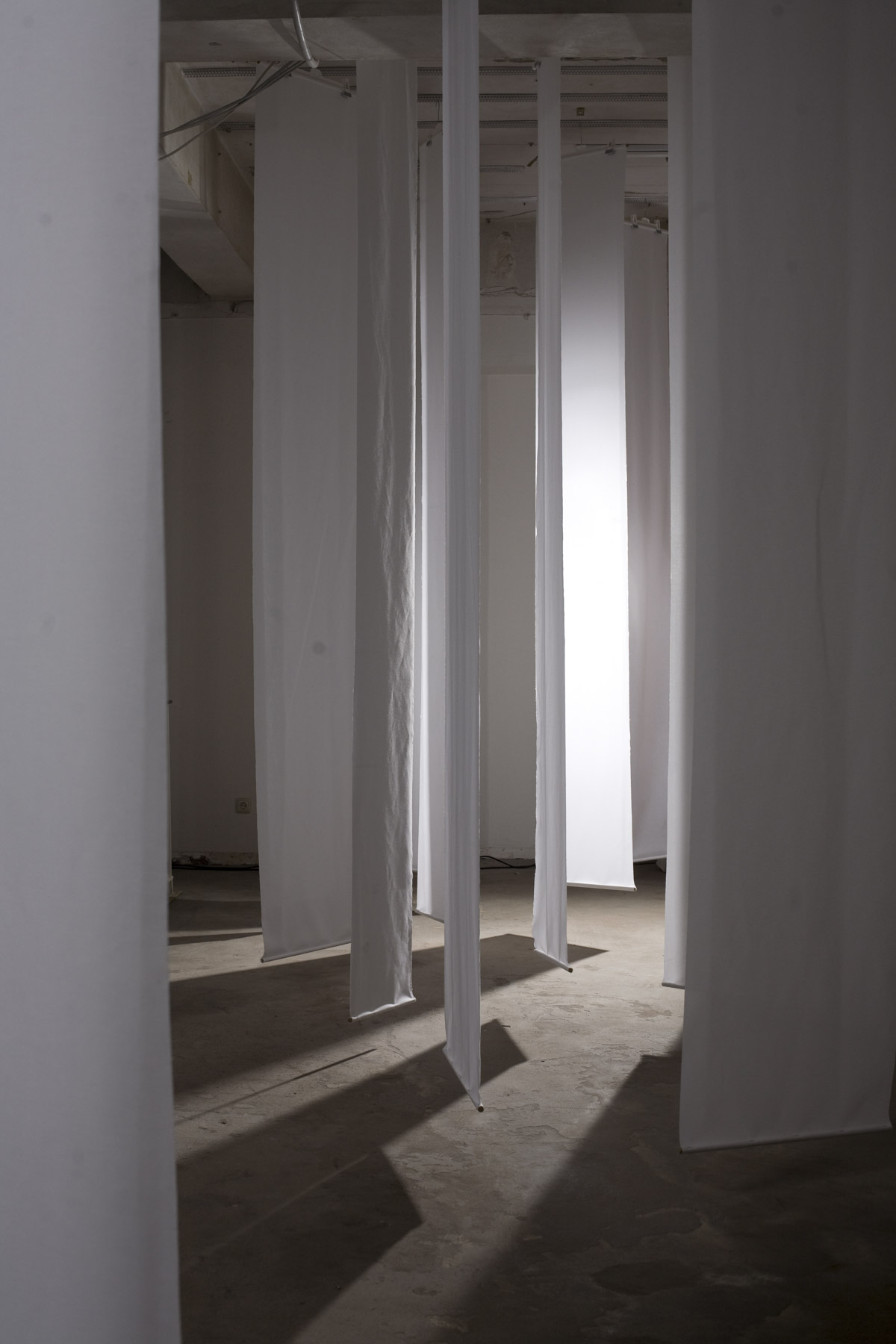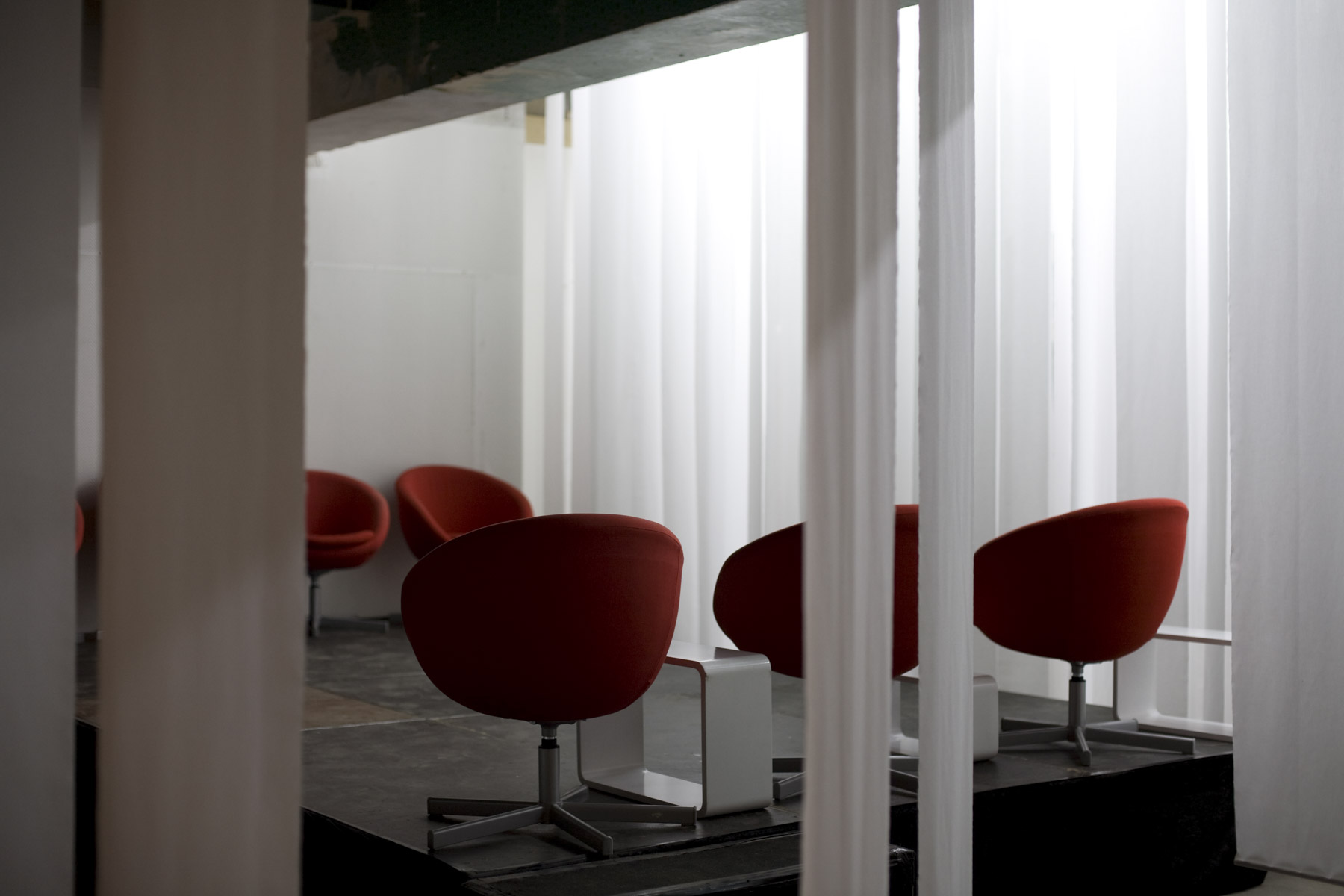 Auch das Podium - Ort für Diskussionen vor, zwischen und nach den Filmvorführungen, veränderte seine Gestalt. Leichte, papierne Vorhänge fassten den Raum und schufen eine intime Atmosphäre für Publikum und Diskutierende.