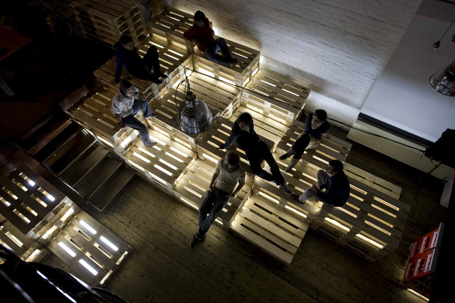 Ein Jahr zuvor, 2008, waren auf unsere Einladung hin, 90 Architekturstudentinnen und Architekturstudenten der TU Berlin in Oberhausen. Es entstanden eine ganze Reihe von kleinen und großen Interventionen um den Bahnhof herum - unter dem Titel "Oberhausen 1zu1".Aus diesem hervorgehend, entstand nun die Zusammenarbeit mit den Kurzfilmtagen Oberhausen. Die Studenten des Fachgebietes von Prof. Donnatella Fioretti erarbeiteten ein neues Konzept für die Lounge der Kurzfilmtage, eine Landschaft aus EUR-Paletten, die den Raum des K14 komplett verwandelte und die Besucher zum Erklimmen und Verweilen einlud.