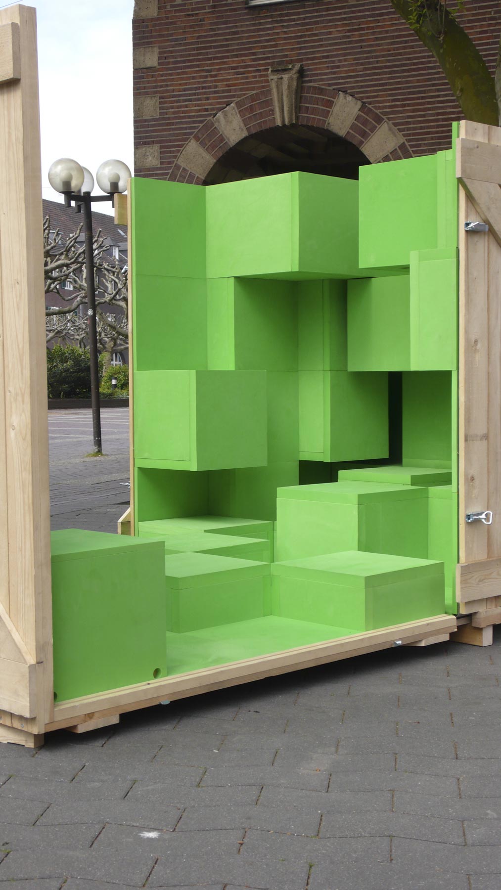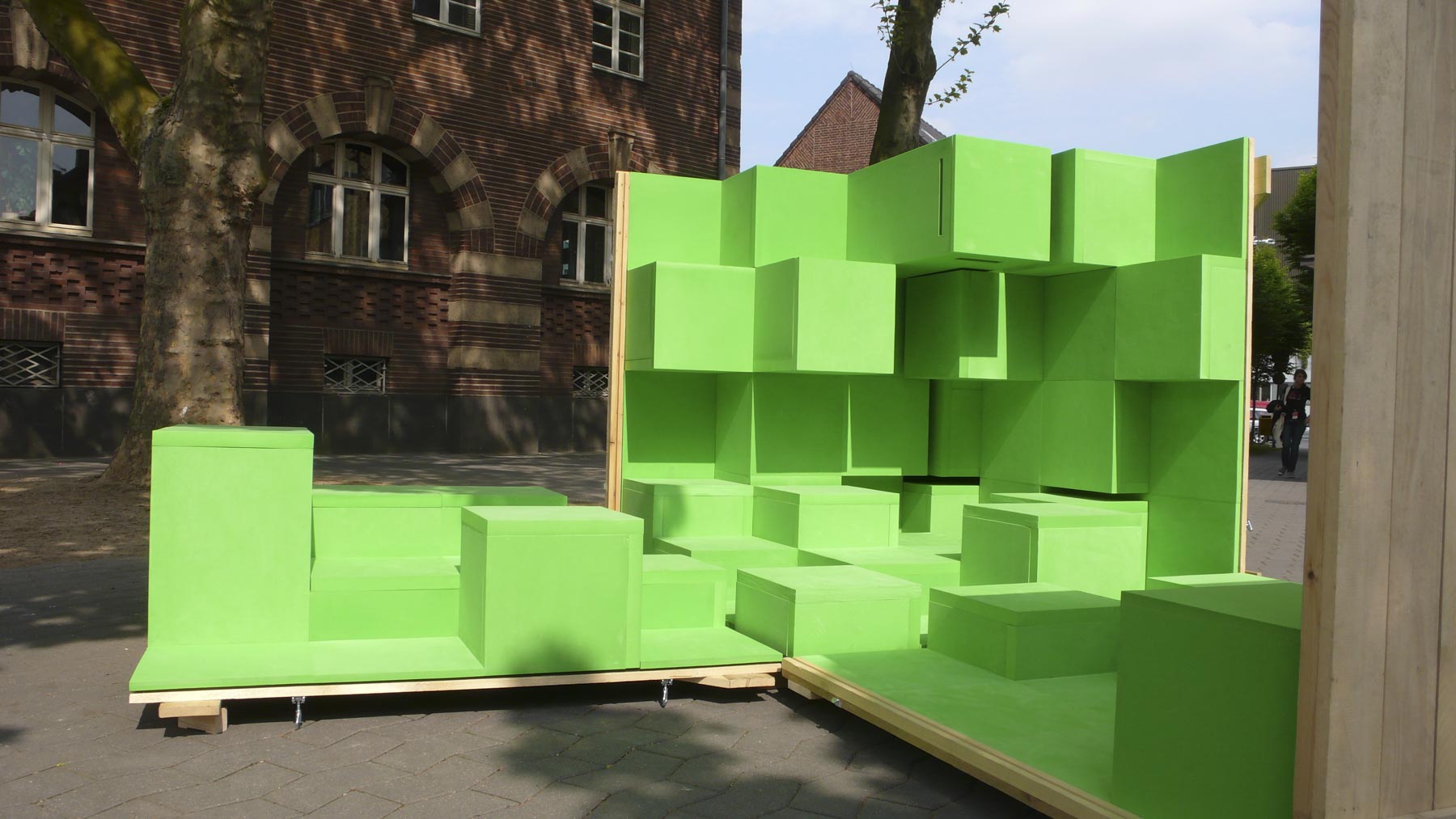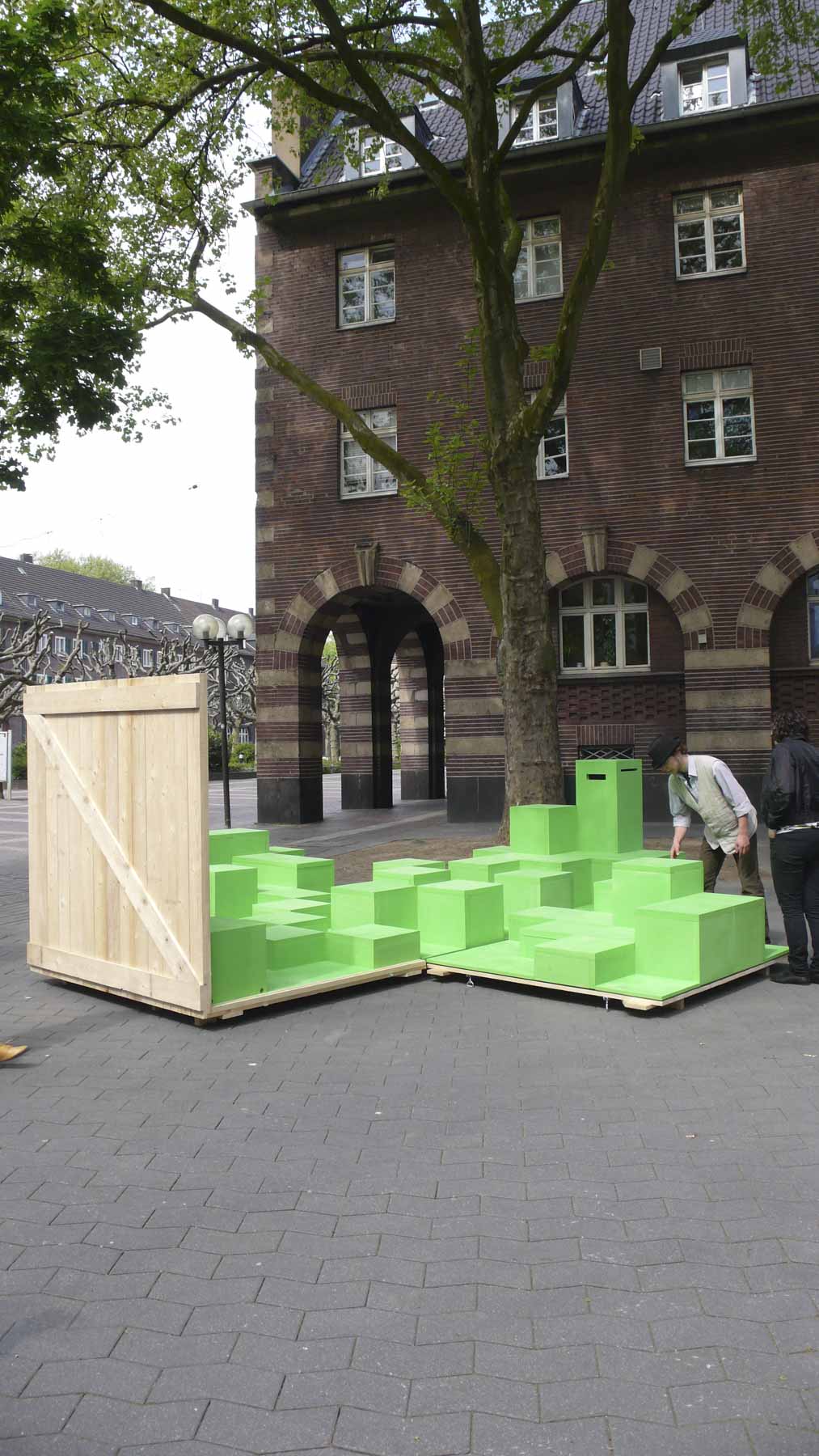 Zu guter Letzt konnte auch der im Vorjahr entstandene Prototyp des Taschenkinos nun von den Studenten in dauerhaften Materialien weiterentwickelt werden. Ein 2x2m großer Würfel entfaltet sich zu einer Sitzlandschaft, Projektionsfläche inklusive. Jetzt trotzt es Wind und Wetter, hat schon so einige Filmforführungen im Freien erlebt und taucht immer wieder an neuen Orten in der Stadt auf.