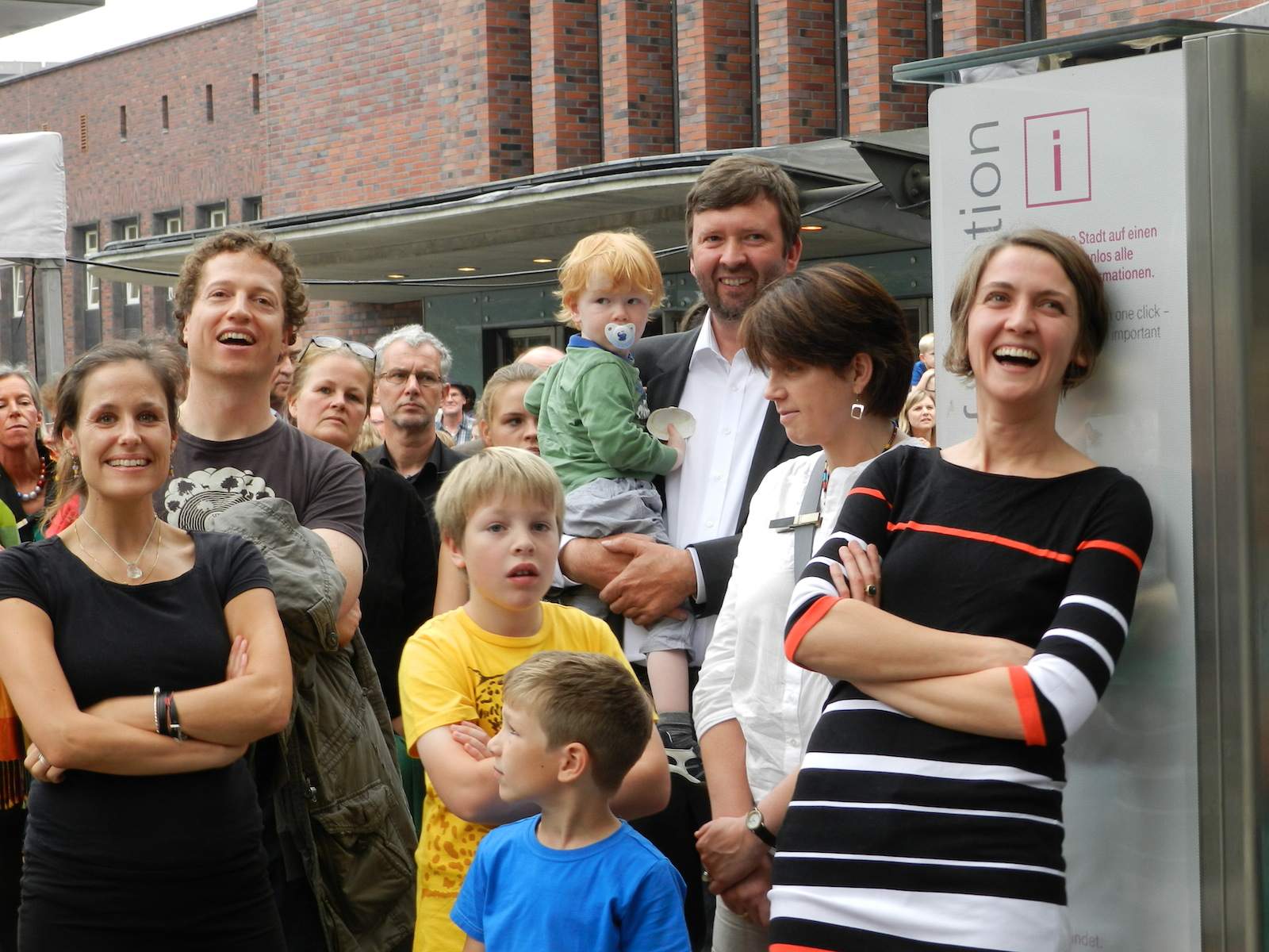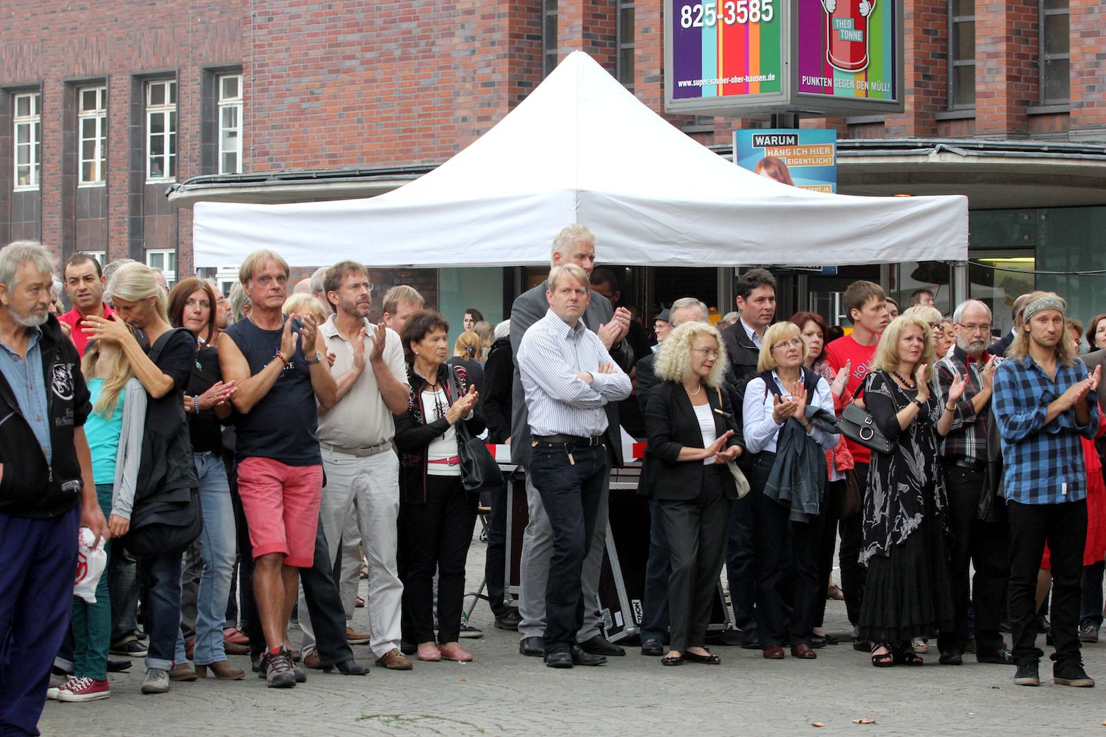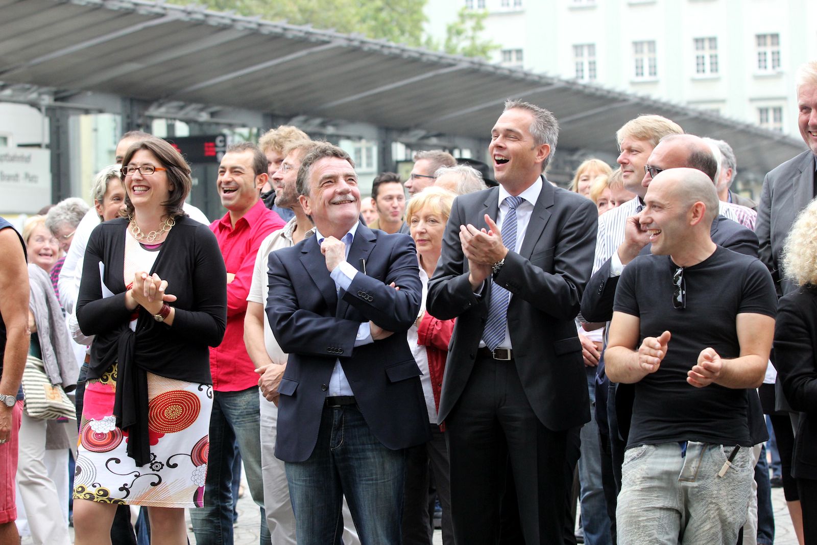 Wir freuen uns, dass so viele Besucherinnen und Besucher den Weg zu uns und hoch in die neuen Etagen genommen haben. Auf dem Willy-Brandt-Platz spielten 2 großartige Bands: „Tim, Toto & die Freedes“ aus Bochum und „Lord Mouse and the Kalypso Katz“, die zu achtzehnt aus Berlin angereist sind. Es herrschte eine tolle Stimmung: Calypso ließ die zeitweiligem Wolken vergessen. Zuvor im offiziellen Part zur Einweihung des renovierten Turms wurde die zu solchen Anlässen übliche Redefolge durch eine Gesprächsrunde mit an der Umbaumaßnahme Beteiligten ersetzt. Das Land NRW wurde in dieser Runde von Michael Groschek, Minister für Bauen, Wohnen, Stadtentwicklung und Verkehr des Landes Nordrhein-Westfalen, repräsentiert.