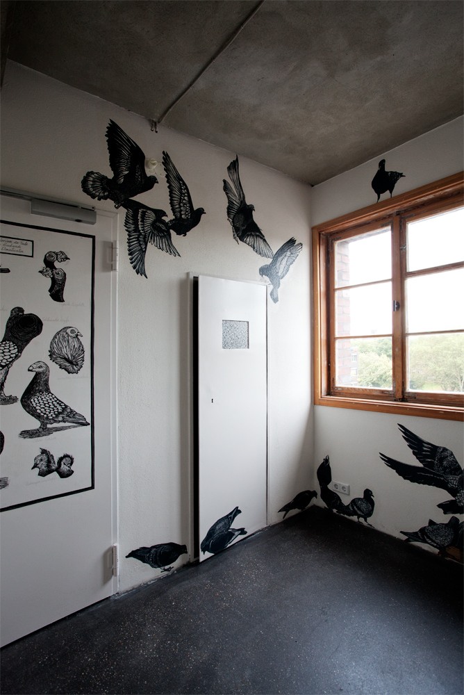 Das Treppenhaus ist seit der Eröffnung nun auch von Tauben bevölkert. Es sind Holzschnitt-Arbeiten von „Kollektiv Tod“ aus Berlin und Strasbourg.